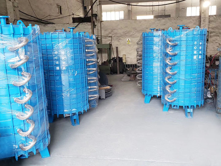 該設備的換熱麵積,具有較大的靈活調節性,可按用戶生產工藝需要增加或減少中間層(器身)片數進行組裝,一般可在1.5m2-12m2範圍內調節。